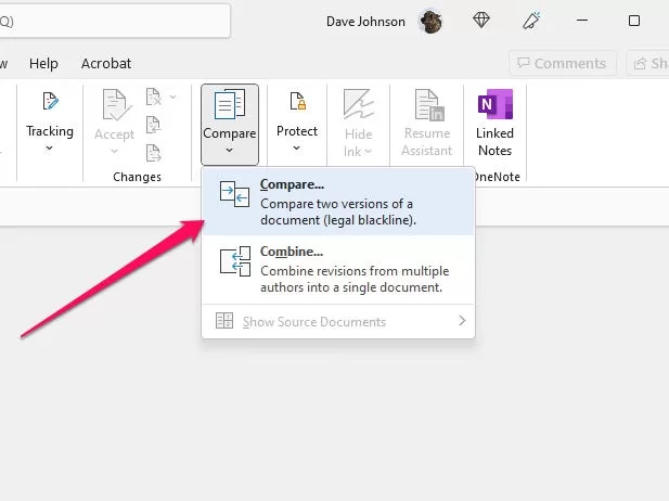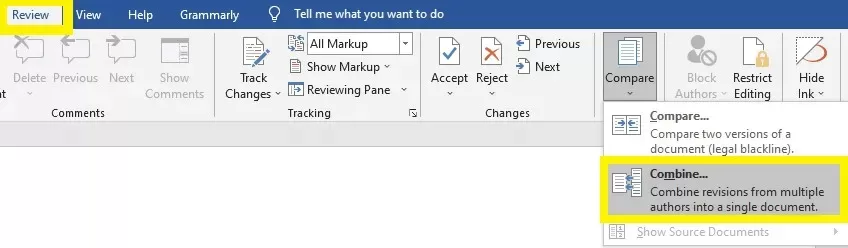 - Go to Review > Compare > Combine…