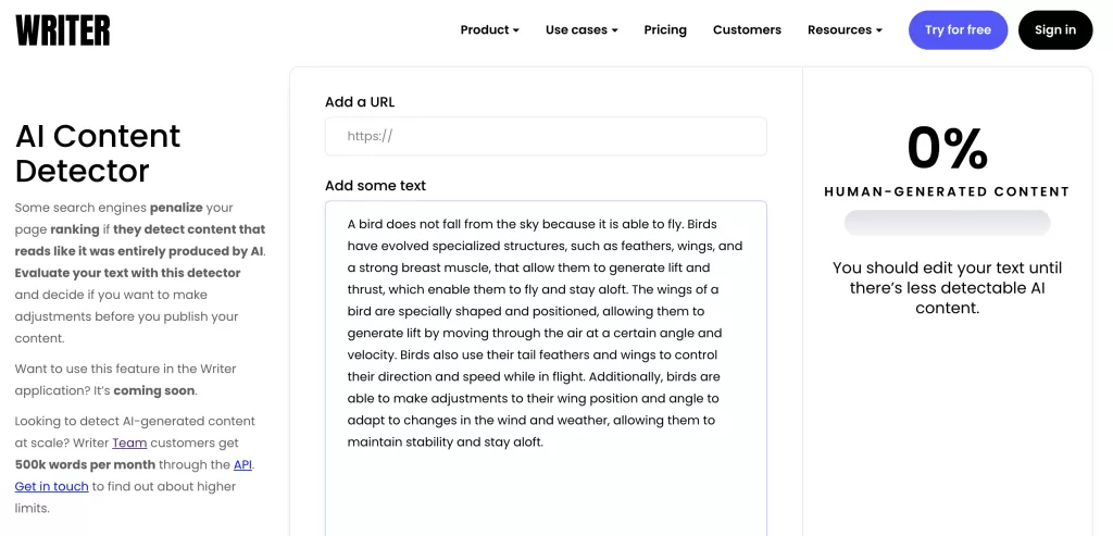 Writer.com provides a free AI content detector tool. Just paste the text and get quick results with a percentage of human vs AI content.