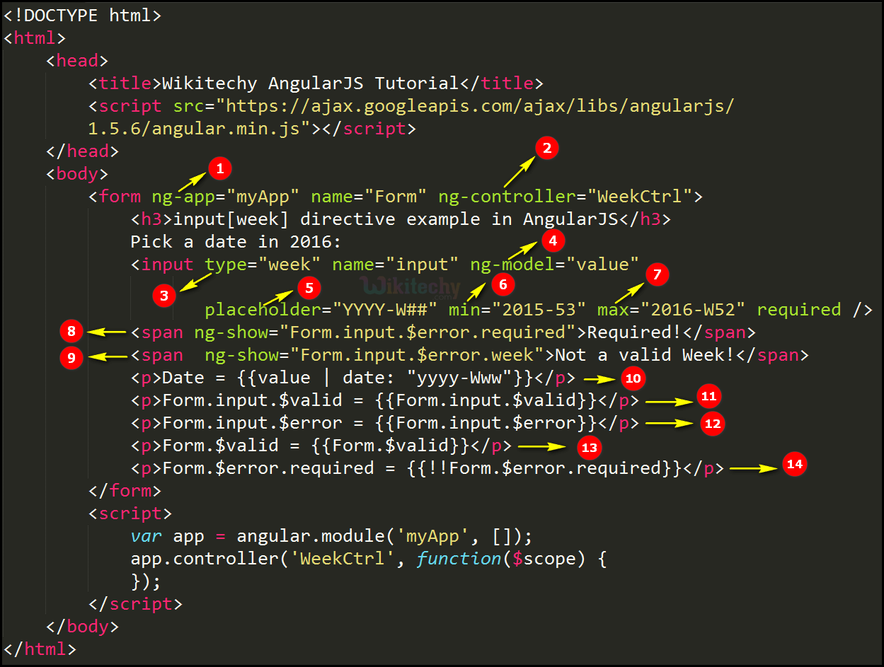 - Ng-controller specifies the application controller in AngularJS the controller value is given as “WeekCtrl”.