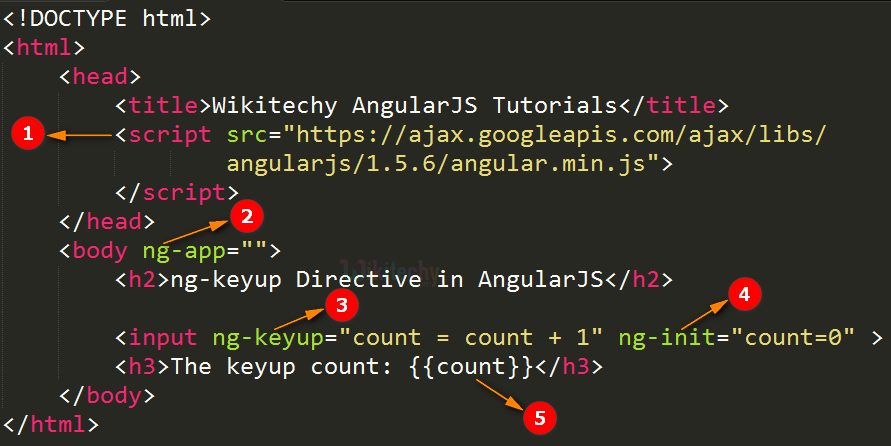 The ng-keydown= “count=count+1” is used to increase the count variable by one, every time a keypressed in the input field is finished.
