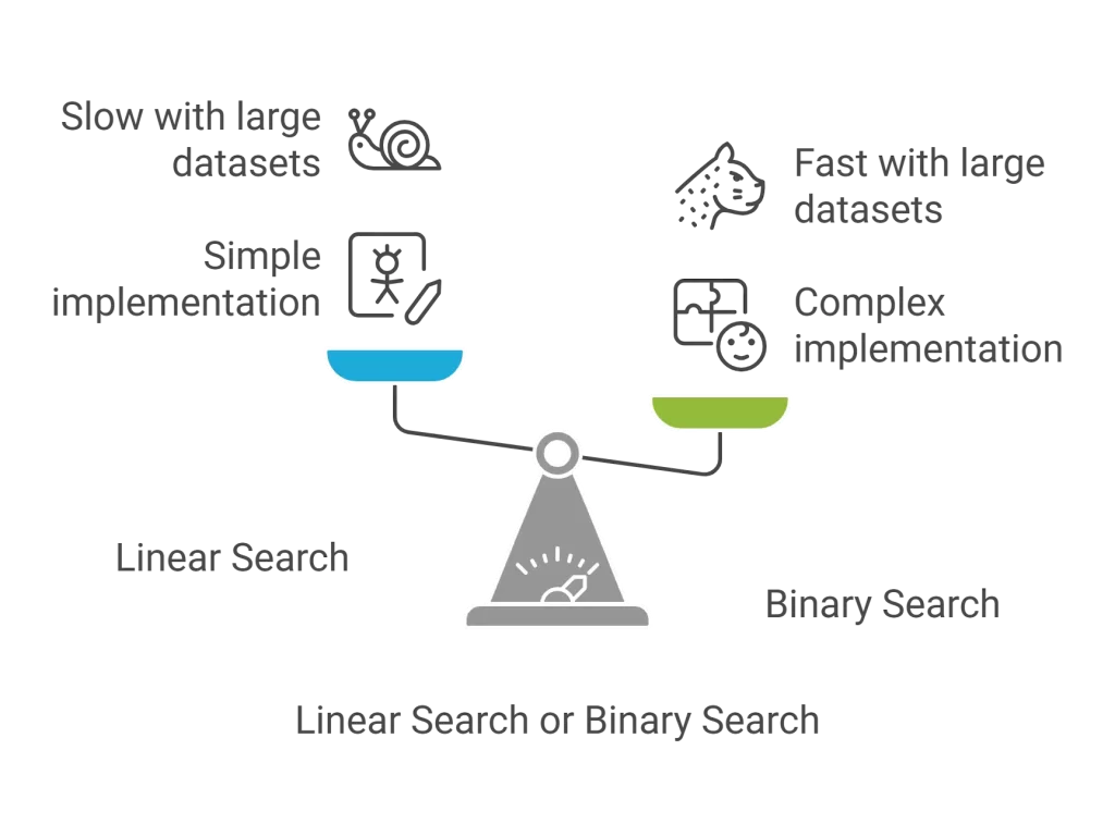 If you are new to programming, you might wonder why you can’t just check every element one by one. That method is called Linear Search. Here is a quick comparison of the two: