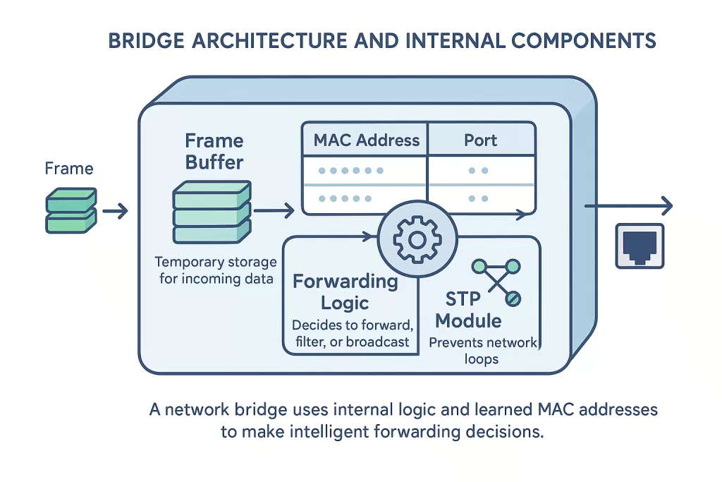 When data packets come in, the bridge checks their source and destination MAC addresses, learns which devices live on which side, and decides whether to forward or filter the data. This reduces unnecessary traffic, improves performance, and keeps collisions in check.