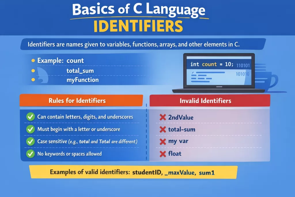 Identifiers are names you give to variables, functions, arrays, and other user-defined elements in your code. Think of them as labels that help you identify different parts of your program.