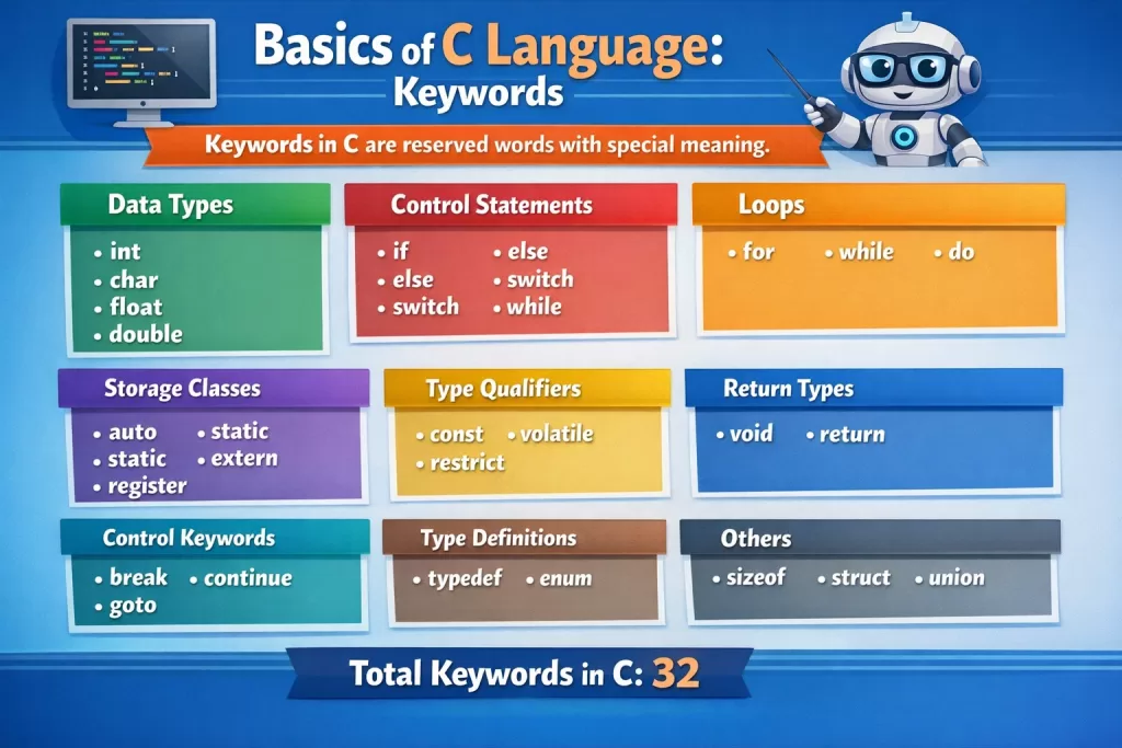Keywords are reserved words in C that have special meanings. You cannot use them as variable names or function names. C has 32 keywords, and each one serves a specific purpose.