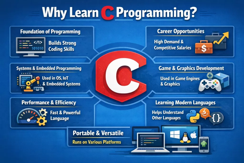 • Procedural Thinking: C teaches you to think logically and break problems into smaller steps.