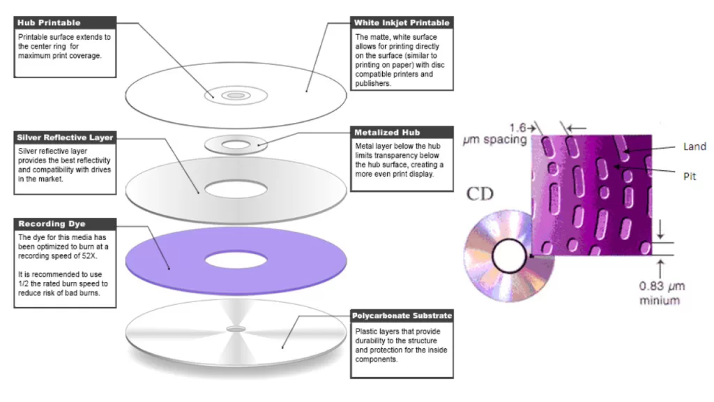 Ever wondered about the rainbow sheen? It’s due to light diffraction from micro-pits on the disc surface, not dye or coating. When sunlight or room light hits those pits, it spreads into a full spectrum—hence the disco rainbow effect.