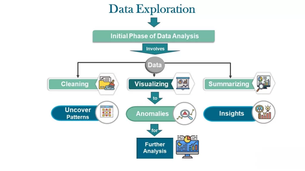 Unlike confirmatory analysis, which focuses on testing predefined hypotheses, data exploration is more open-ended. The goal is to ask questions like: