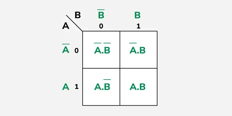 In the 2 variable k-map, four squares are constructed. Each square contains one term of expression with two variables.