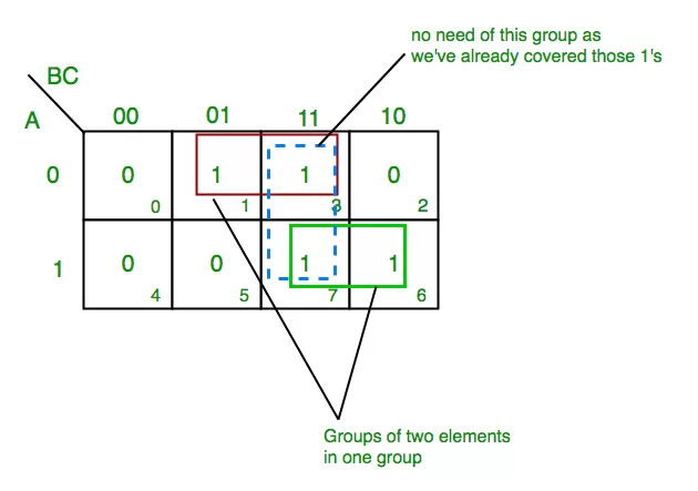 - From the groups made in step 5 find the product terms and sum them up for SOP form.