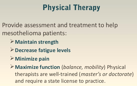 Physical Therapy- help patients recover from the sufferings of the mesothelioma treatment.
