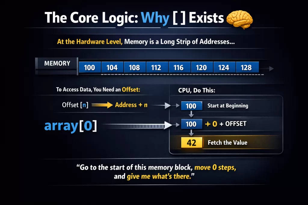 When you write array[0], you tell the CPU: “Go to the start of this memory block, move 0 steps, and give me what’s there.”
