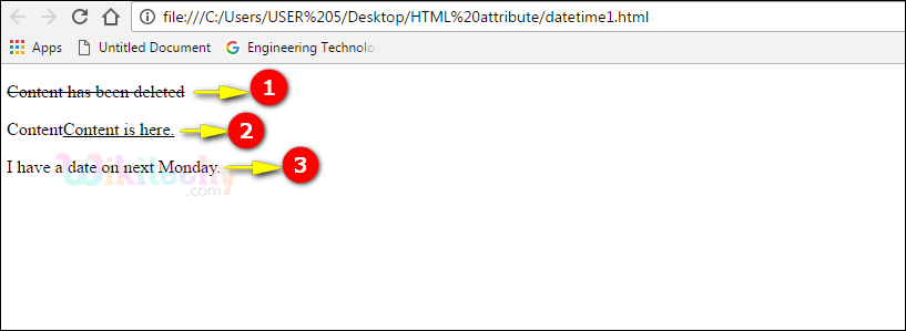 <ins> element is used along with the datetime attribute. As content is shown in output.