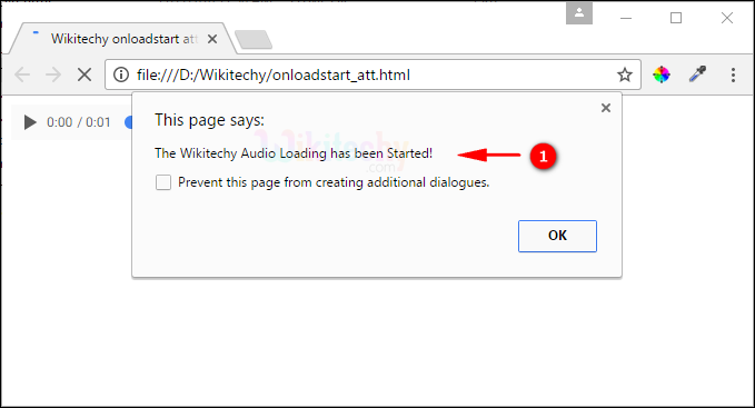 - loadStart JavaScript function show an alert message “The Wikitechy Audio Loading has been Started!”.