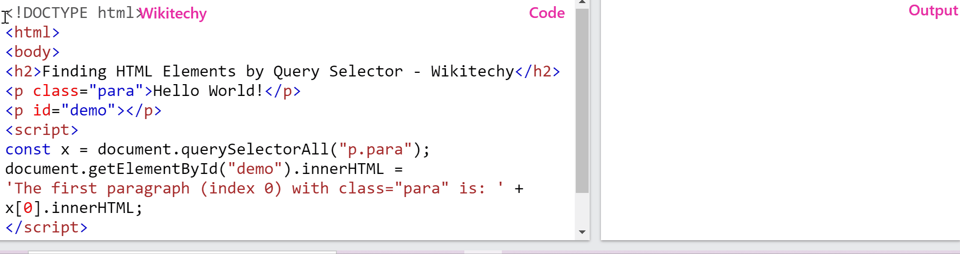 <!DOCTYPE html><html><body><h2>Finding HTML Elements by Query Selector - Wikitechy</h2><p class="para">Hello World!</p><p id="demo"></p><script>