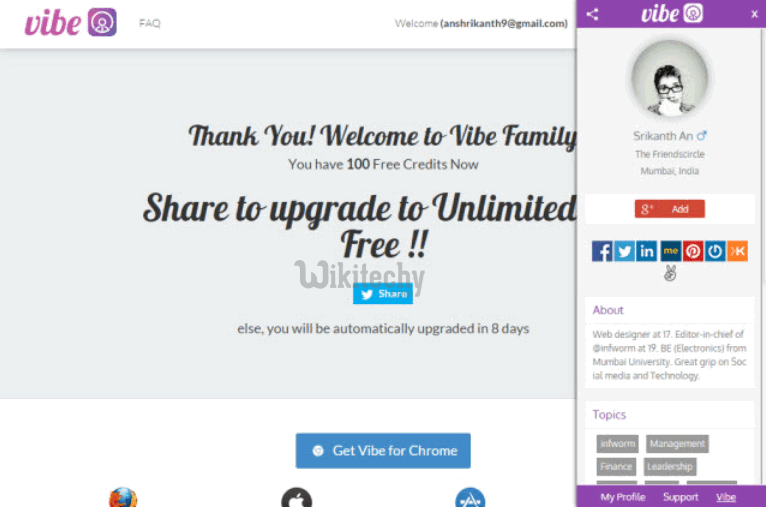 Vibe App makes sure that no information is left out – The person’s about description, Organizations, Favorite topics, websites and uploaded photos. In addition to Google Chrome, Vibe app also provides plugin for Mozilla Firefox and works even outside your Gmail Inbox (Outlook, Yahoo or even a custom email). All you need is an Email address to draw out a lot of information about any contact and learn more about them to establish meaningful relationships.