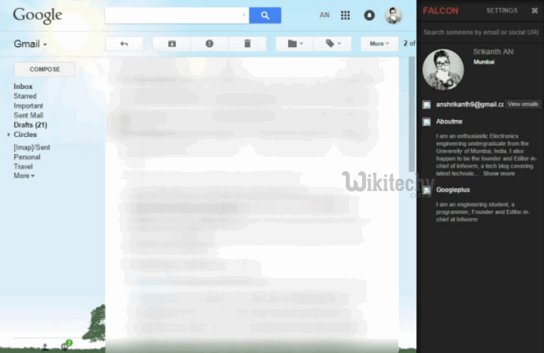 Falcon.io is a New York based startup that provides a social discovery tool, that could be a decent Rapportive alternative. While fairly on the lower-end in terms of features, this tool extracts a complete about me profile and their Google Plus links. In addition to these Falcon.io provides information across 14 social media networks including Hackernews, Tweetdeck, Twitter, Quora, Behance and more.