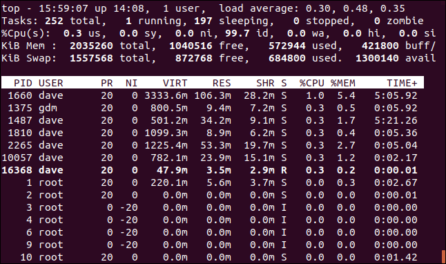 The top command displays a screen packed with information. The values are updated every few seconds.