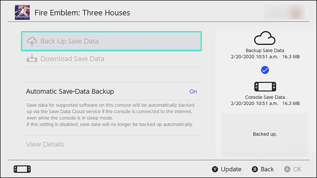 selected “All Save Data” from the menu, you can select any game title and choose to “Back Up Save Data” to the Nintendo Cloud or “Download Save Data” to your device. If these options are blurred out, it means the cloud system has automatically done this for you. Information on the current status of your cloud storage is shown on the right.