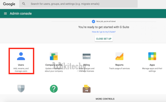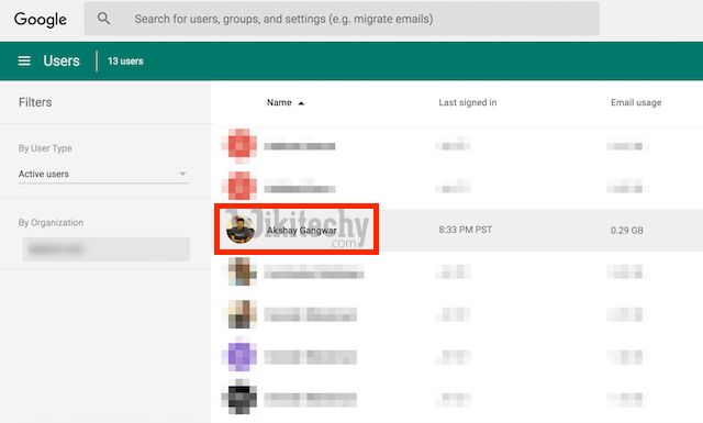 - Log into your G Suite administrator account, and go to the Admin console. Here,click on “Users”, to view all the users in your organization.