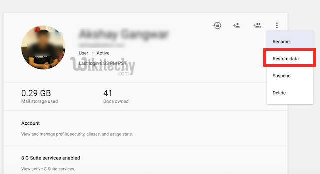 - Then, in the user’s page, click on the three dot iconon the top right, and click on “Restore Data“.