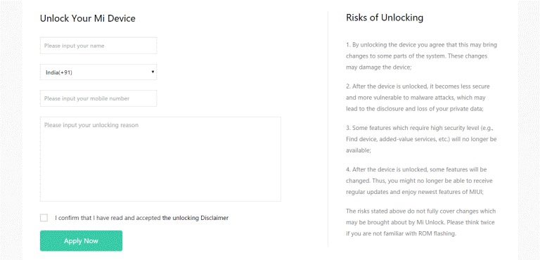 - Now click on the Unlock Now and log in with your Mi account details and fill all details.