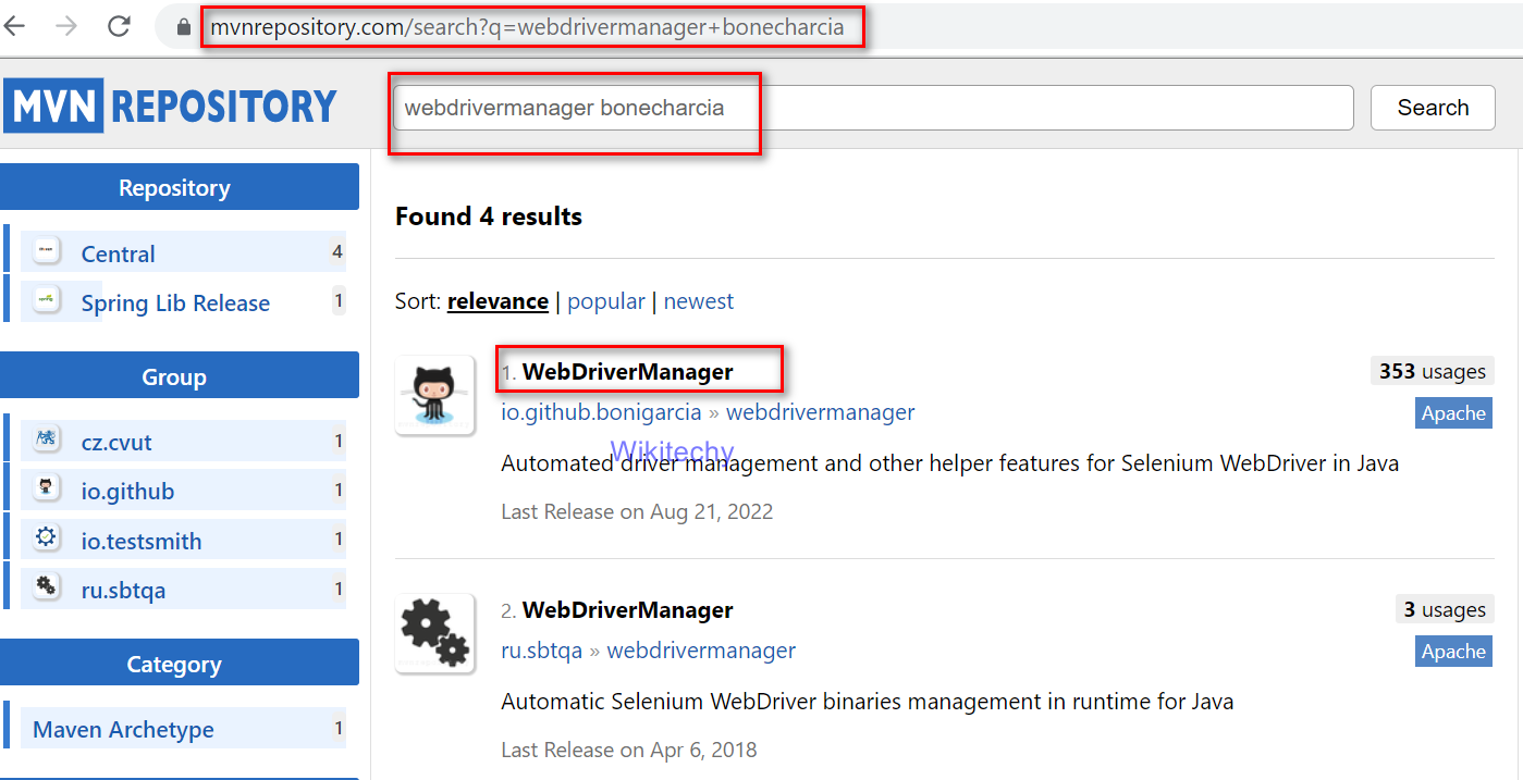 - Next Dependencies that we need to add is web driver manager dependencies which can also be got from the maven central repository. Click this URL: https://mvnrepository.com/ and search webdrivermanager bonecharcia which takes us to the https://mvnrepository.com/artifact/io.github.bonigarcia/webdrivermanager