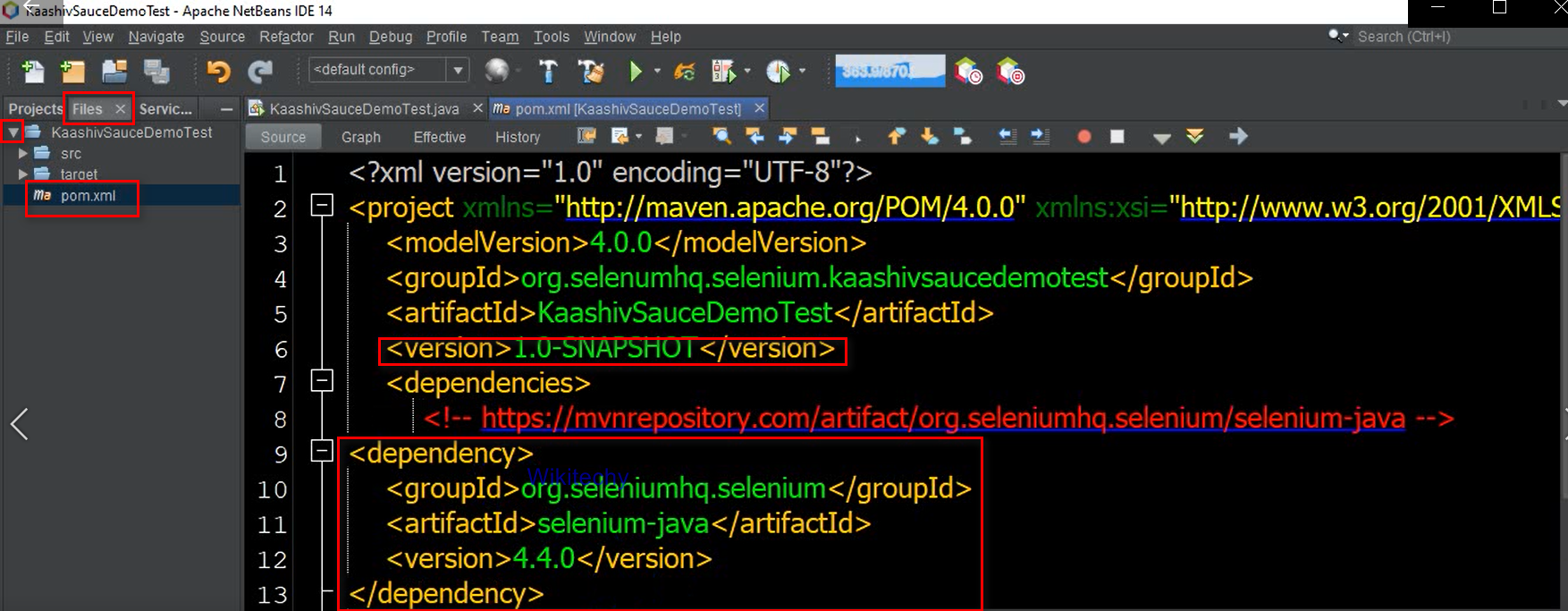 - The above dependency needs to be added in the pom.xml file in our project. Next go to our project files there we have a tab called Files. Click that we can find the pom.xml file. Click on the pom.xml file. In the XML file after the /version tag create a new tag called as <dependencies> and </dependencies>. Copy the above dependencies between these tags and save the dependencies.