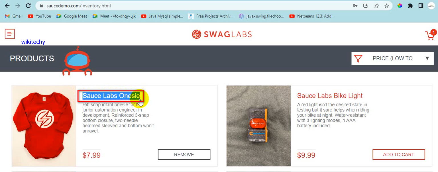 - After getting the product name let us validate if the product name "Sauce Labs Onesie" matches with our output.