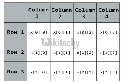 int x[3][4];- Here, x is a two dimensional array. It can hold a maximum of 12 elements.