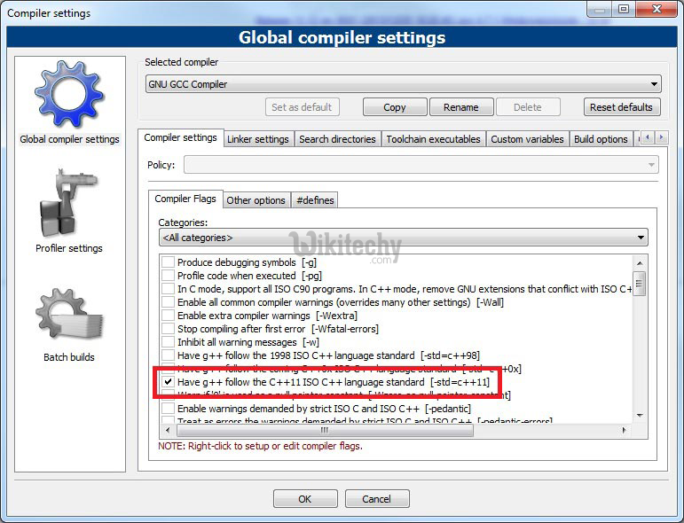 - Then check the box marked “Have g++ follow the C++11 ISO C++ language standard [-std=c++11]: