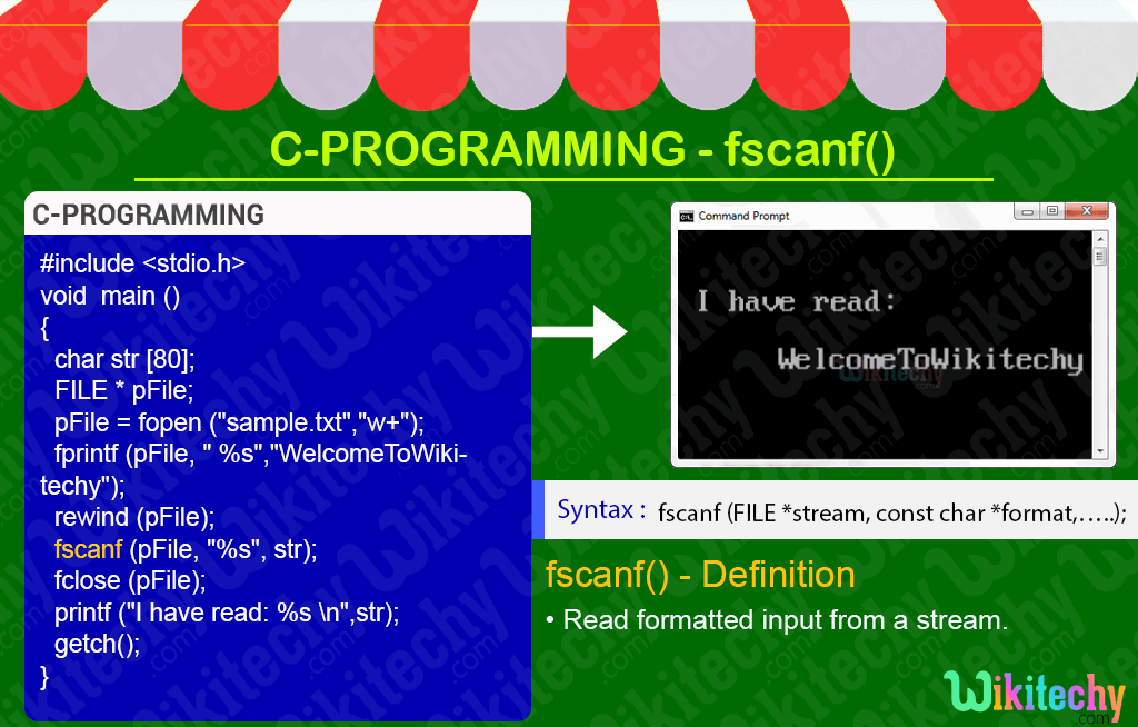 - In C – Programming, the fscanf function is used to read formatted input from a stream.