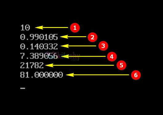 - Here in this output we print the Exponential value 7.389056 of the variable “e” (where e=2).