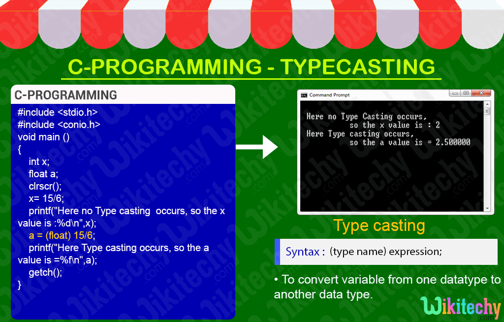- In C- Programming the type casting is used to convert the variable from one datatype to another data type, after we perform casting the variable datatype will be changed.