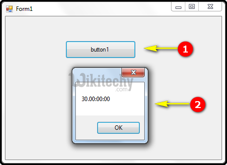 - In this output we display the "30.00:00:00" which specifies difference between (Date2 - Date1 = 30days) displayed in message box window.
