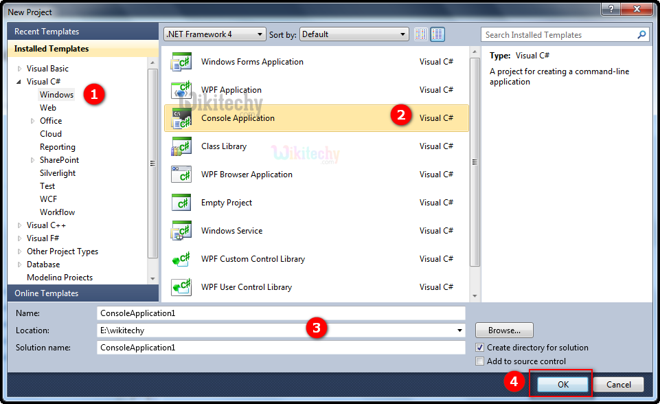 - Expand Installed, expand Templates, expand Visual C#, and then choose Console Application.