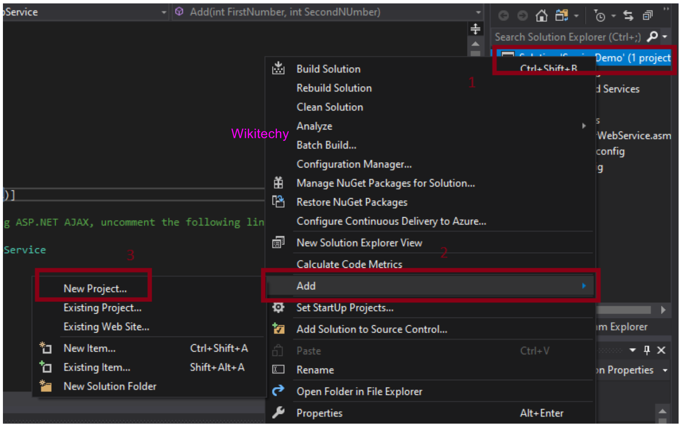 - Right-click on the Solution explorer->Add->New Project as shown in the below screenshot: