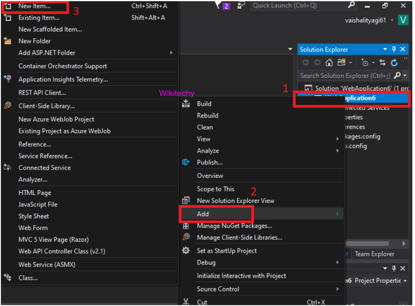 - We will do the right click on the project name-> Click on Add-> Add New Item. As shown in the below screenshot: