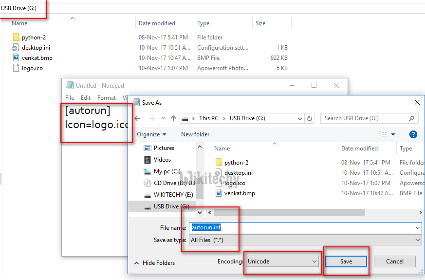 - Step 3 : Store the file in the name of autorun.inf in the usb drive