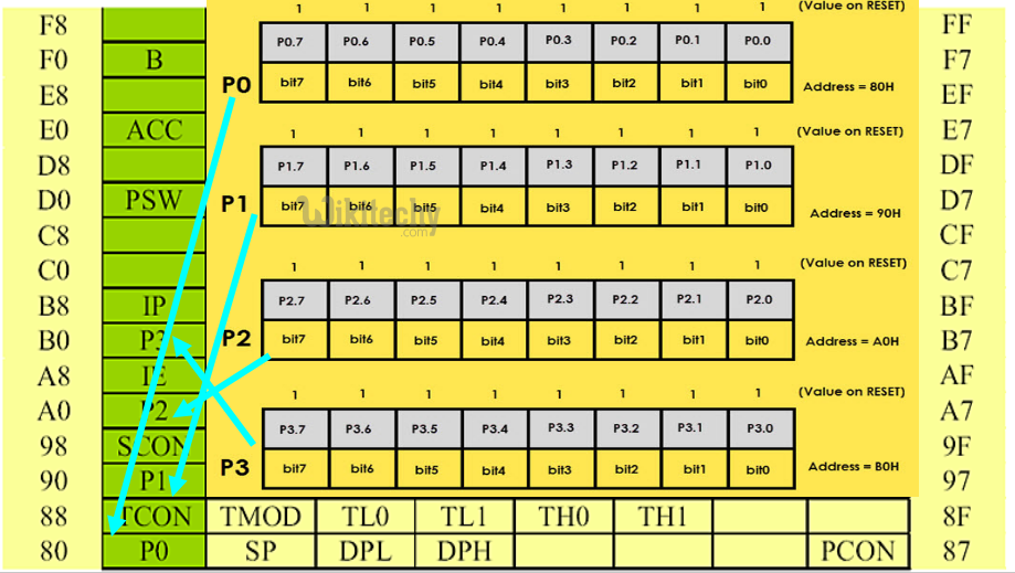 - Each bit in these SFRs corresponds to one physical Pin in the 8051 Microcontroller. All these Port Registers are both Bit Addressable and Byte Addressable. Writing 1 or 0 on a Port Register Bit will reflect as an appropriate voltage (5V and 0V) on the corresponding Pin.