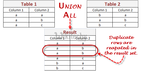 - It is different from UNION operator in a way that it does not remove duplicate rows between the various SELECT statements.