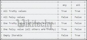 - Returns true if any of the items is True. It returns False if empty or all are false. Any can be thought of as a sequence of OR operations on the provided iterables.
