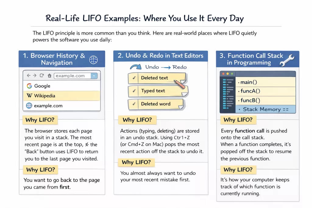 When you browse the web, your browser stores each page you visit in a stack. Every time you click a link, it’s “pushed” onto the stack. When you hit the “Back” button, the most recent page is “popped” off and removed from the history. This is pure LIFO in action.